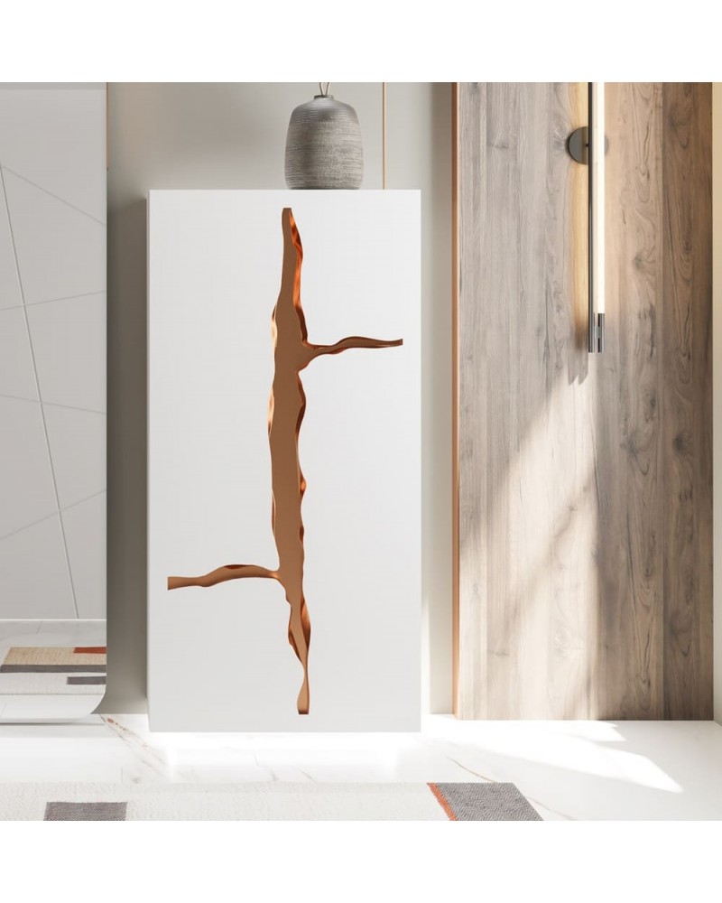Embellece tu hogar con nuestro zapatero lacado en blanco alto brillo, adornado con elegantes detalles en cobre. Complementado con un espejos vertical en cobre, este mueble de dimensiones 60 x 124 x 29 cm, añade un toque de sofisticación a tu entrada. Con capacidad para organizar tus zapatos de manera ordenada, este zapatero combina funcionalidad con un diseño moderno y elegante, creando un espacio acogedor y con estilo.