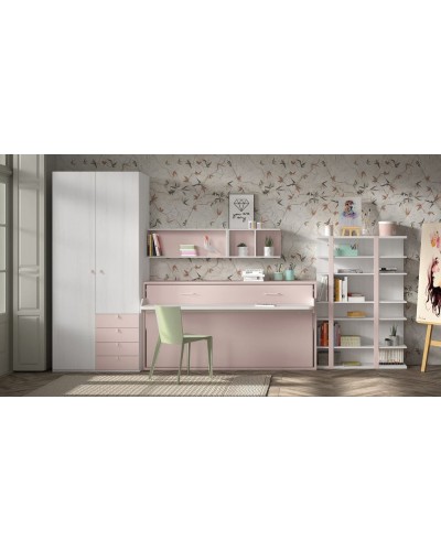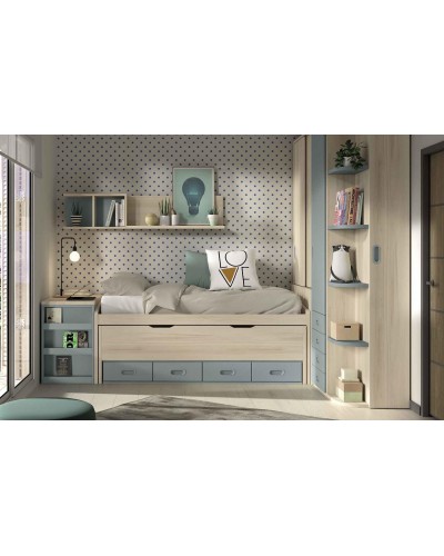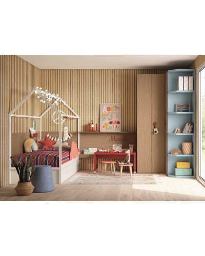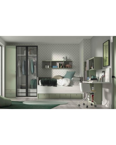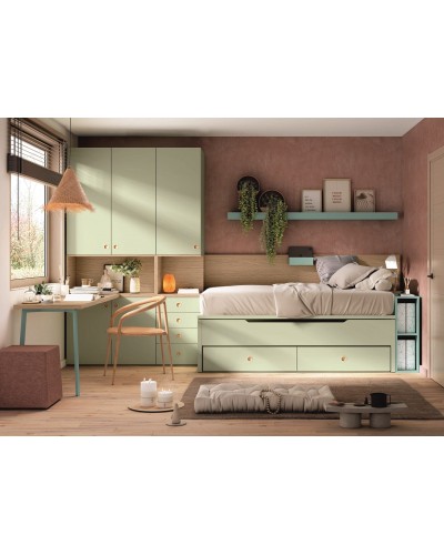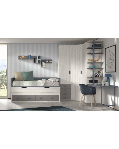 Optimiza el espacio del dormitorio juvenil con nuestra cama nido, acompañada de un armario rincón y una mesa de estudio, todo en tonos beige. La cama nido es perfecta para disponer de una cama adicional para invitados, mientras que el armario rincón maximiza el almacenamiento, ofreciendo amplio espacio para ropa y accesorios. La mesa de estudio proporciona un área dedicada para tareas y actividades creativas, asegurando un entorno organizado y funcional. Este conjunto combina estilo y practicidad, ideal para un dormitorio juvenil bien aprovechado.