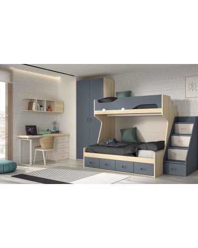 Este conjunto es ideal para habitaciones pequeñas o para jóvenes que buscan un espacio propio y funcional con un toque de color y estilo. La combinación de roble claro, mostaza e índigo crea un ambiente acogedor, alegre y original.