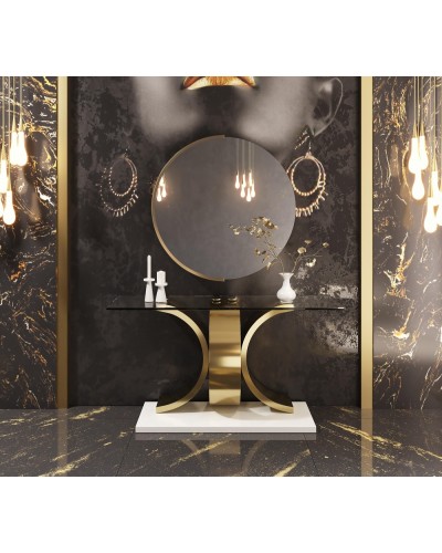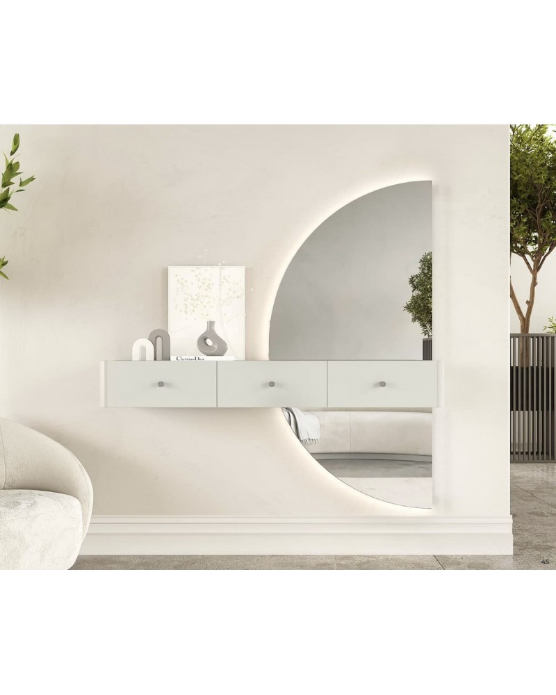 Diseño escultórico y funcionalidad se encuentran en este recibidor de la colección Nala, una pieza que no pasa desapercibida. Su forma de semicírculo vertical aporta movimiento visual y equilibrio, convirtiéndose en un elemento decorativo cargado de personalidad. Disponible en tres medidas (100, 120 y 150 cm de ancho), cada versión incorpora prácticos cajones centrales —dos o tres según el tamaño— para mantener el orden con estilo. La iluminación LED integrada realza su silueta y añade una atmósfera cálida y sofisticada. Ideal para entradas que buscan sorprender desde el primer paso.