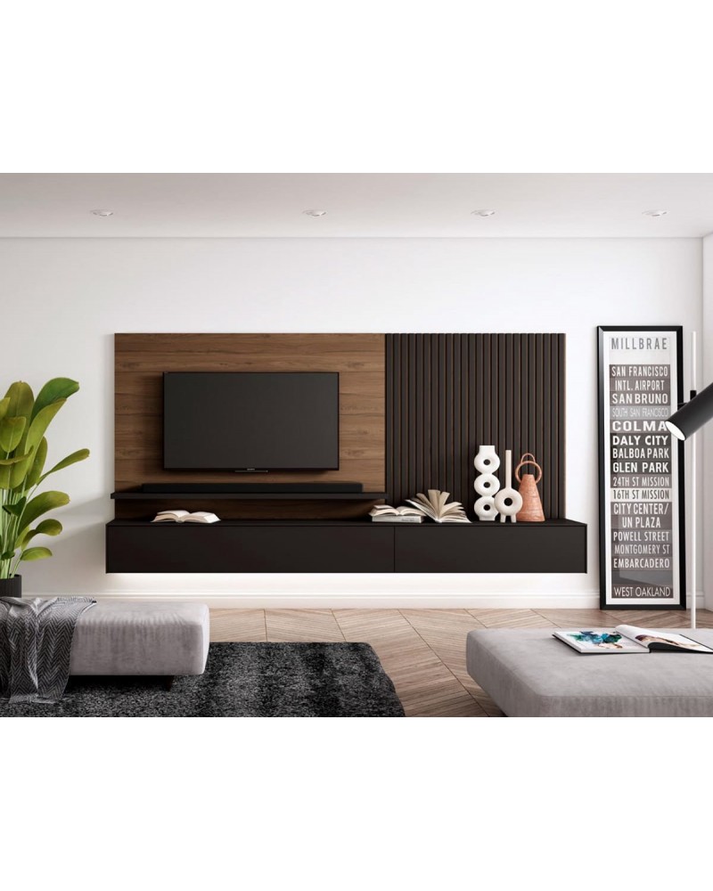 Pannel Home TV+ENTABLILLADO SOBRE MÓDULO. Panel televisión de 128cm de altura con mecanizado trasero para soporte Vogel´s, pasacables, estante para barra de sonido,…. y compatible con pannel entablillado de 4cm de grosor. ¿Qué más se puede pedir? Todo preparado para lucir un SALÓN SIN CABLES.