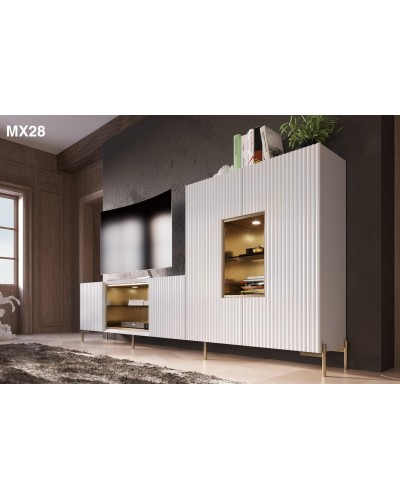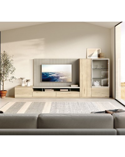 Equilibrio y modernidad en la Composición 13 de la colección Individual de Lanmobel. Su diseño combina líneas depuradas con frentes elegantes y detalles en vidrio que aportan luminosidad y sensación de amplitud. La composición transmite ligereza gracias a sus proporciones bien pensadas, ofreciendo un conjunto contemporáneo que viste el salón con estilo y personalidad.