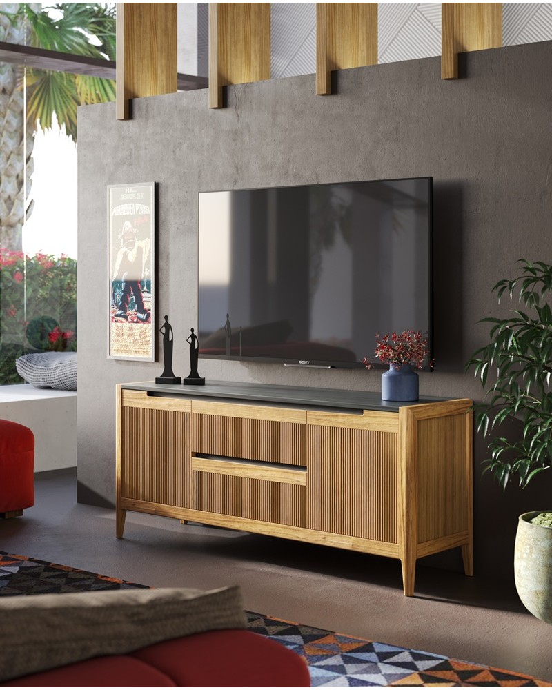 Autenticidad y entretenimiento en el Mueble TV Tallín: madera de pino y frentes rayados para emociones únicas.